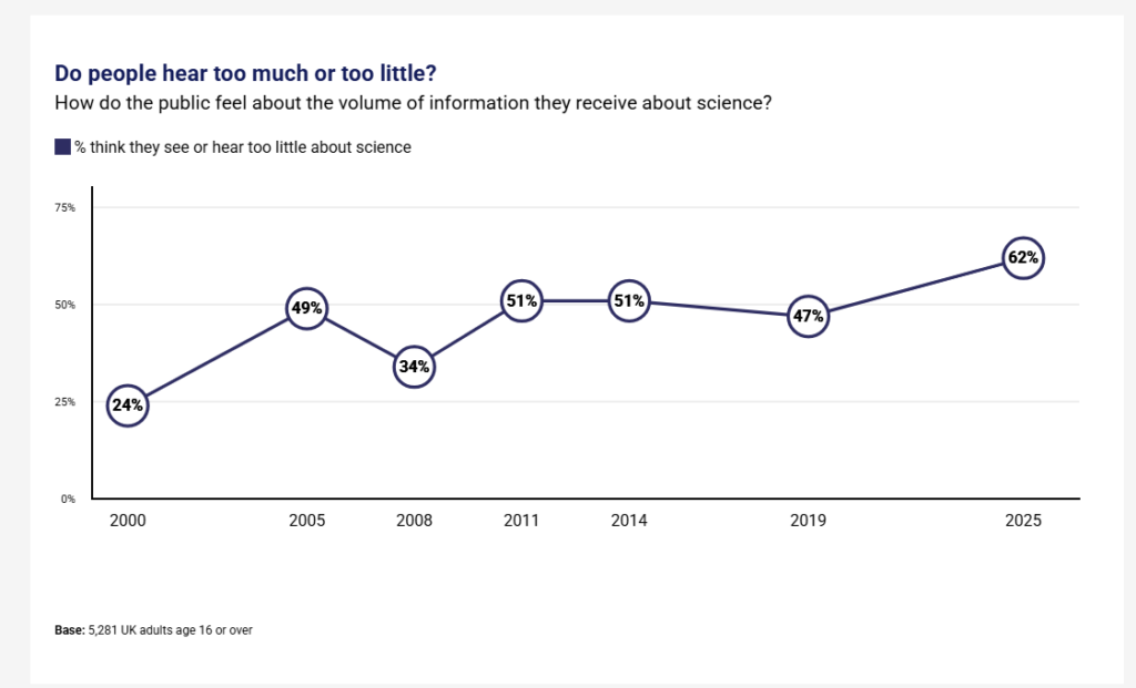 Die Menschen interessieren sich für Forschung! Das zeigt der britische „Public Attitudes to Science Survey“, der 2025 erstmals seit der Pandemie wieder erschien. Gleichzeitig sind die Befragten unsicherer als zuvor, ob die wissenschaftlichen Informationen, die sie konsumieren, wahr sind. Das Vertrauen in Informationen beruhte oft nicht darauf, dass die Konsument*innen diese selbst überprüft hatten, sondern auf vertrauensvolle Quellen und Institutionen. Wenn Personen angaben, wissenschaftlichen Informationen nicht zu vertrauen, nannten sie am häufigsten die Gründe, dass Informationen in den Medien oft unausgewogen, irreführend, widersprüchlich oder falsch seien. Insgesamt waren Personen, die aktiv nach Informationen suchten, auch vertrauensvoller gegenüber den Inhalten – egal, ob die Quelle traditionelle oder neue Medien waren.